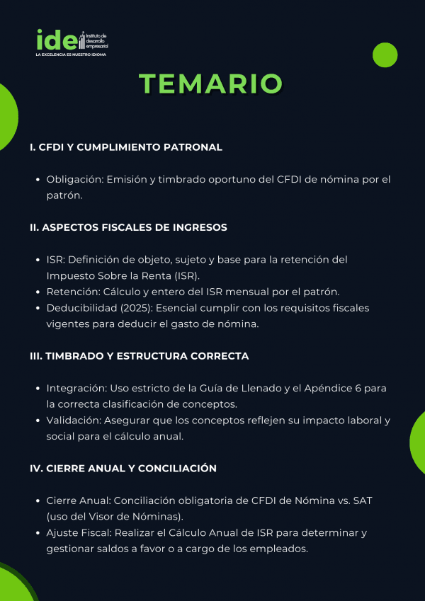 • Anticipación a cambios 2026: identifica los cambios normativos clave en nómina, CFDI y reformas laborales para llegar preparado al siguiente ejercicio.