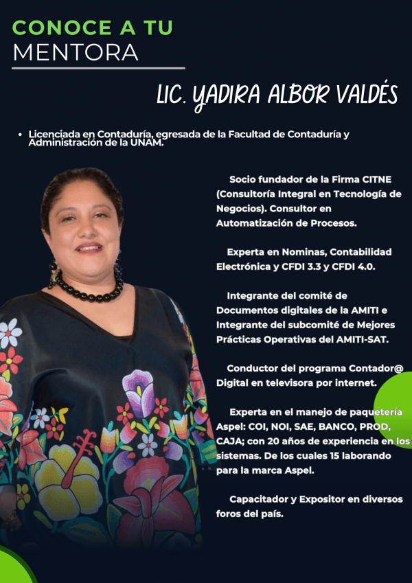 Durante 5 horas intensivas, trabajarás el cierre fiscal de nómina 2025 (incluyendo aguinaldo, subsidio, ajuste vs cálculo anual de ISR), el correcto timbrado CFDI 4.0 y la conciliación con el Visor de Nómina del SAT, de la mano de una experta reconocida en el tema, la Lic. Yadira Albor Valdés. No es teoría suelta: verás fundamentos legales, casos prácticos y criterios operativos que podrás aplicar al día siguiente en tu sistema y en tus papeles de trabajo.