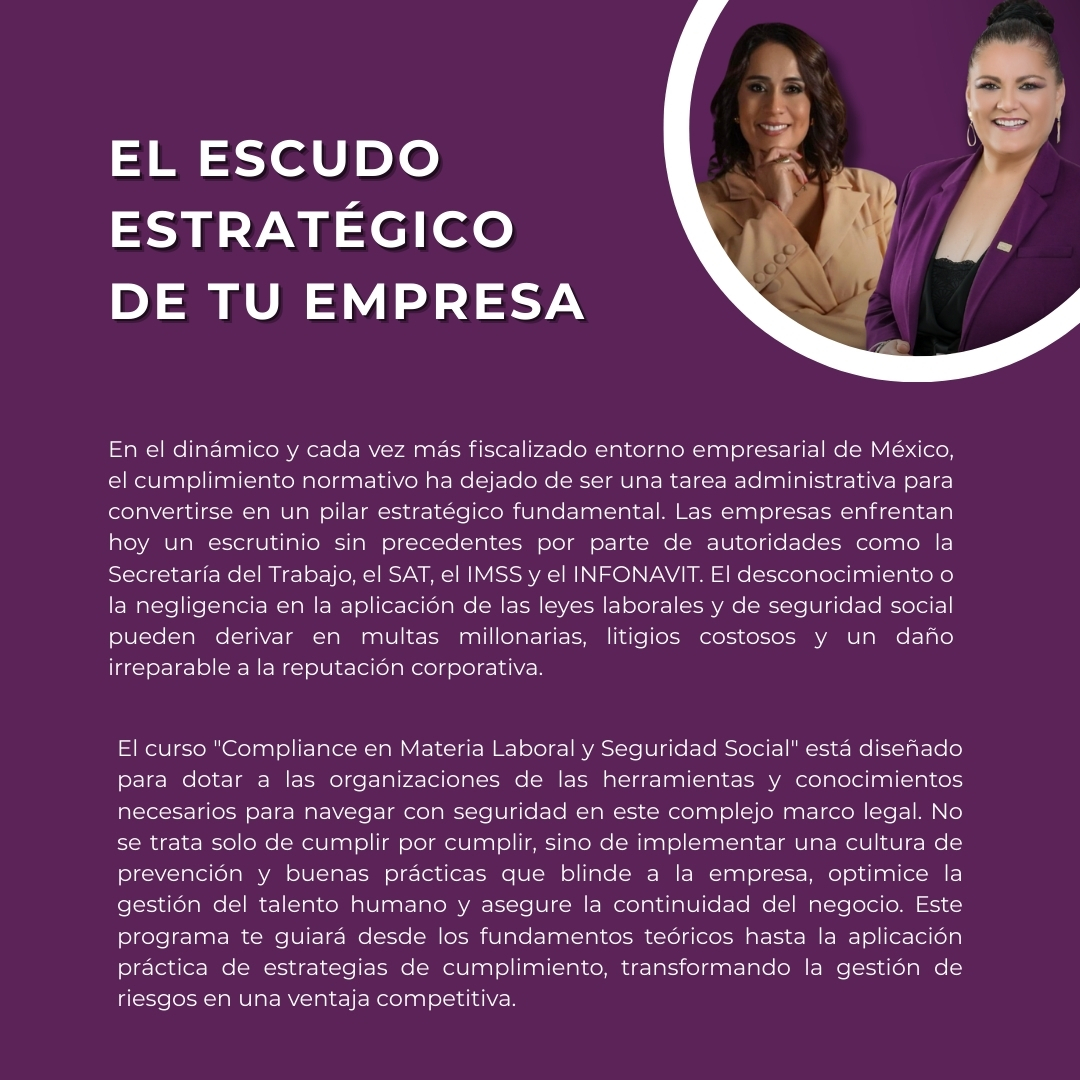 Te conectas el 25 de febrero desde donde estés y trabajas de la mano de la Dr.a Karla Arlae y Kenia Yasbeth, dos expertas que aterrizan la teoría del Compliance en contratos sólidos, cálculos precisos y estrategias preventivas listas para aplicar en tu empresa.